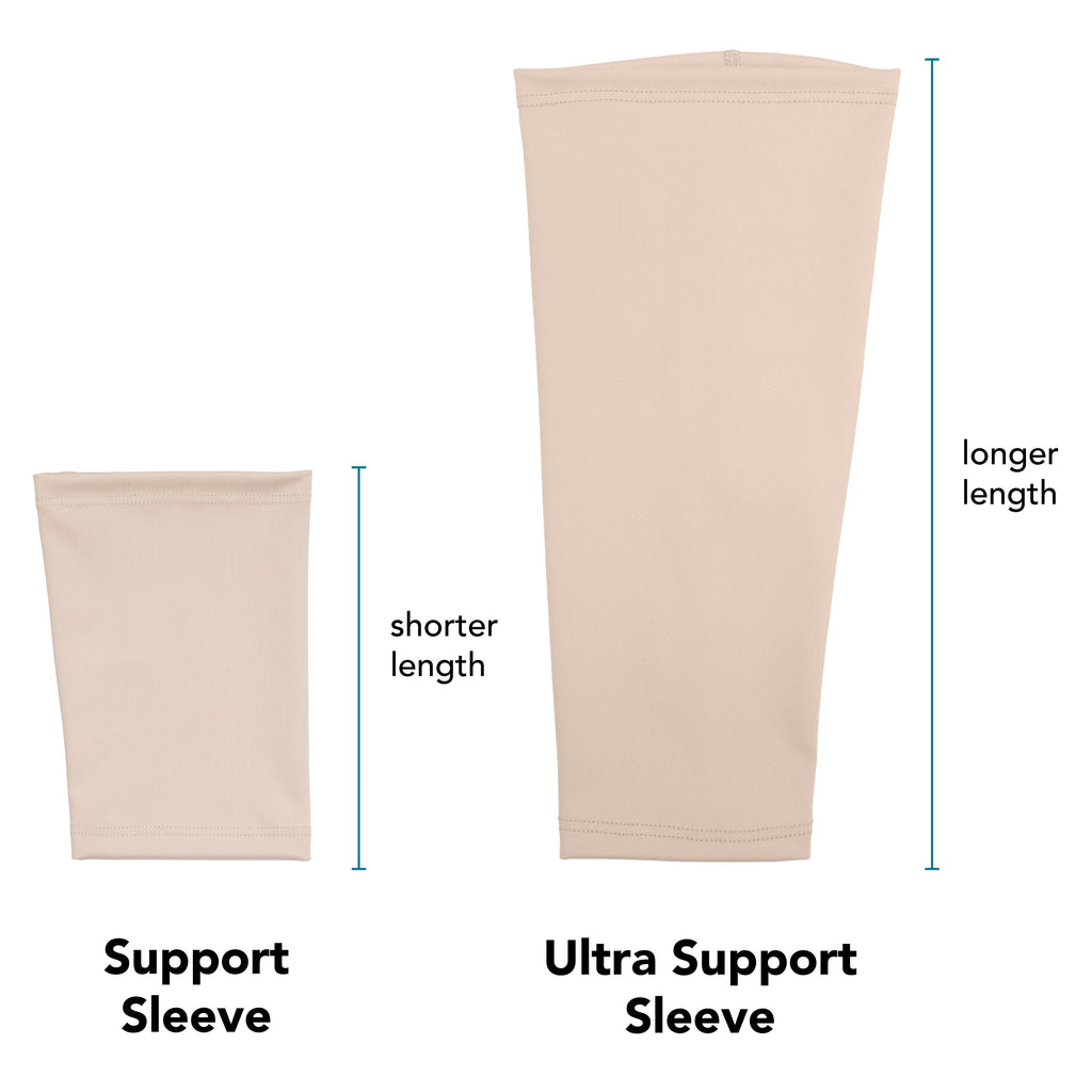 They are sold in pairs and available in two length styles: the standard Support Sleeve and the longer Ultra Support Sleeve. Sized for men, women, and children, they are reusable and can be worn on an arm or a leg.