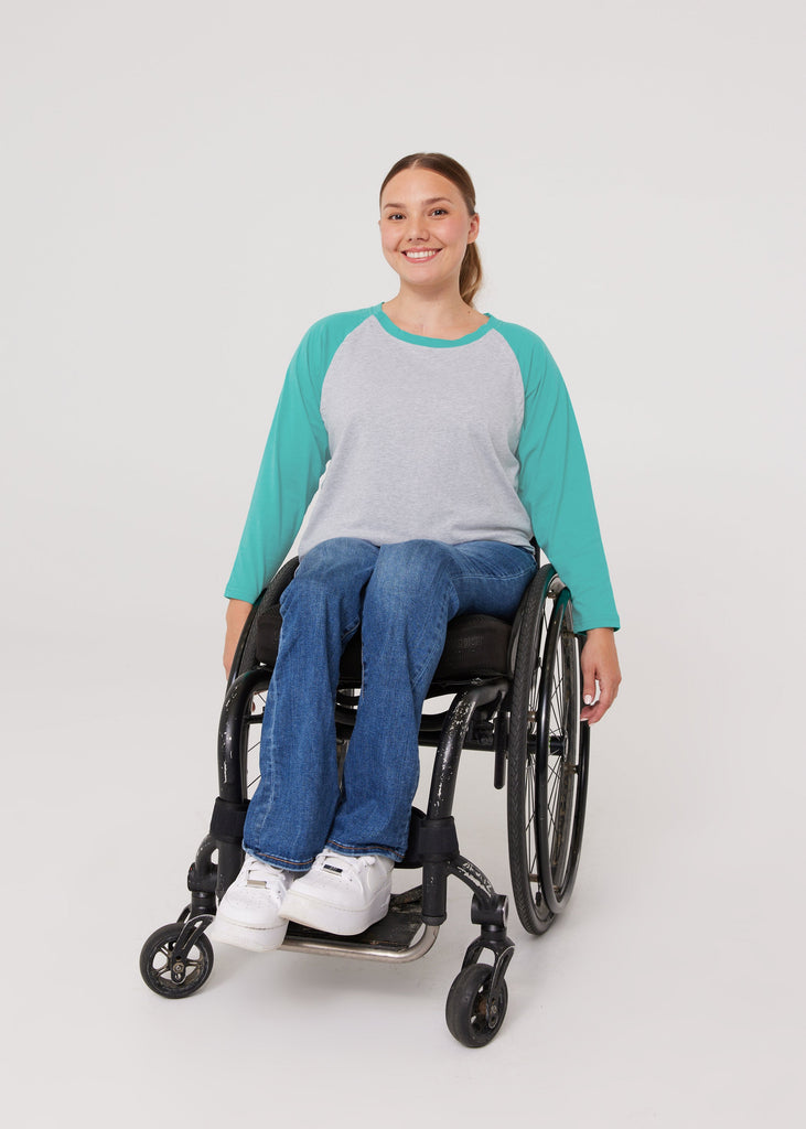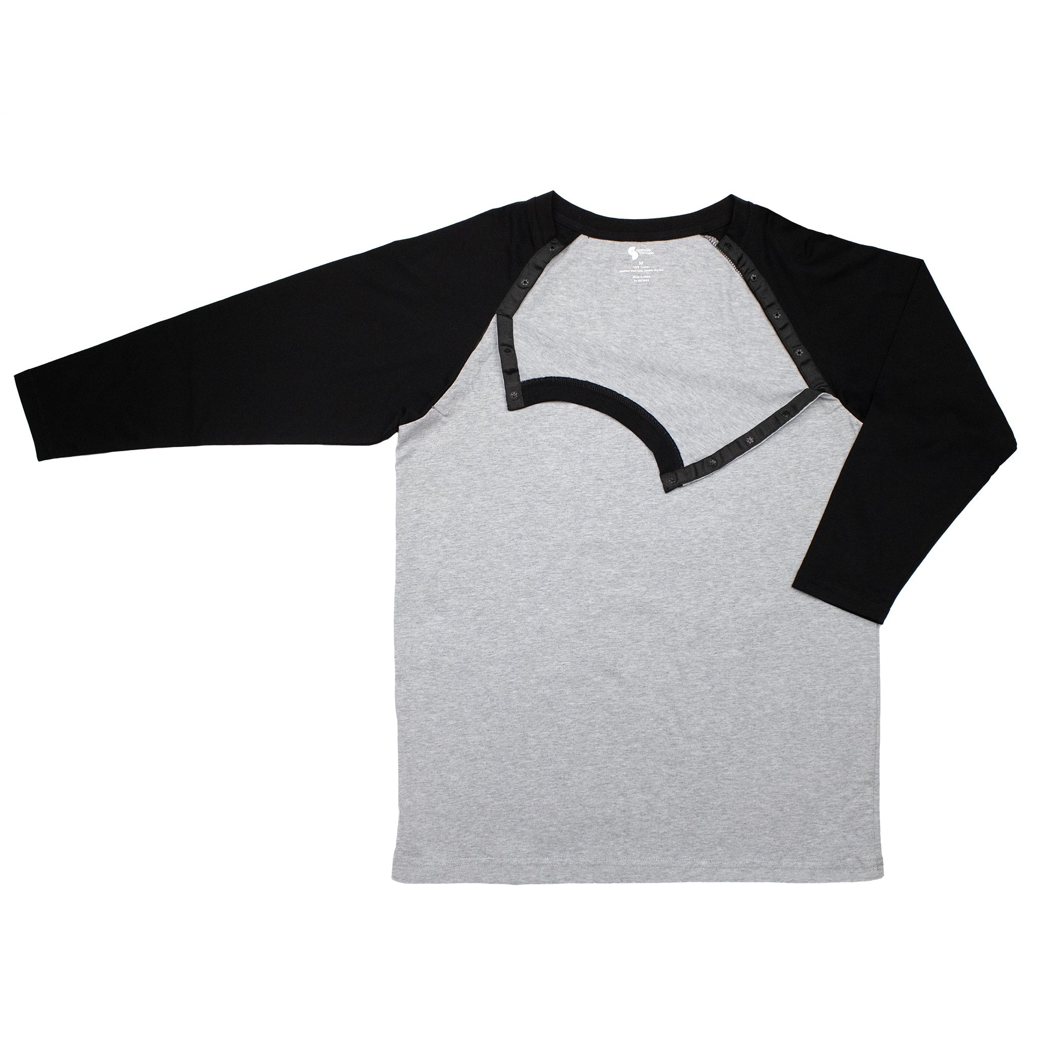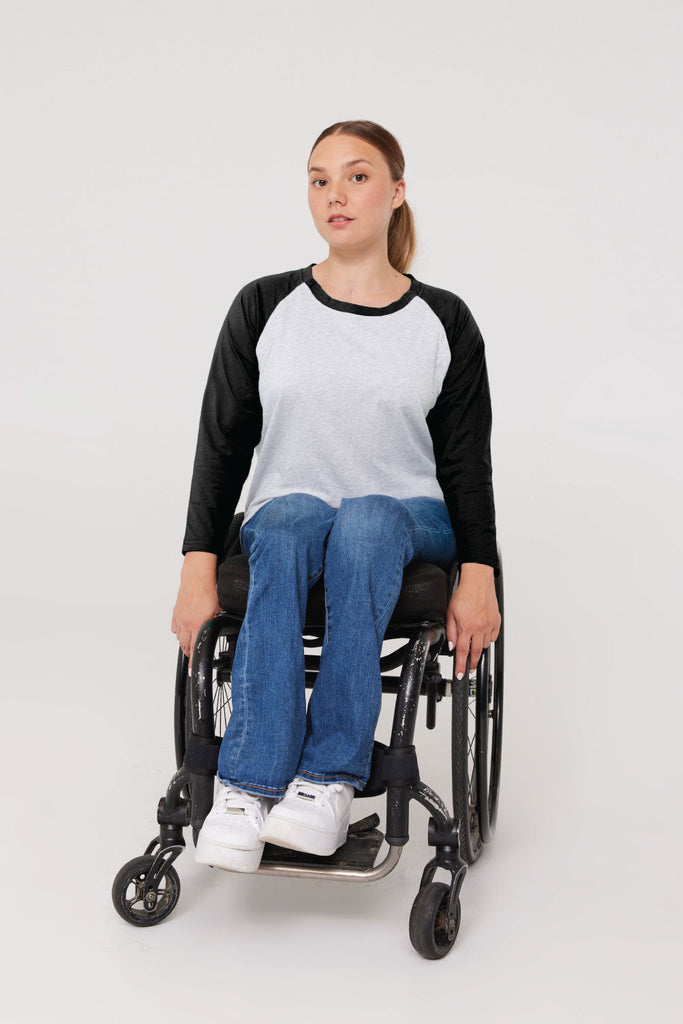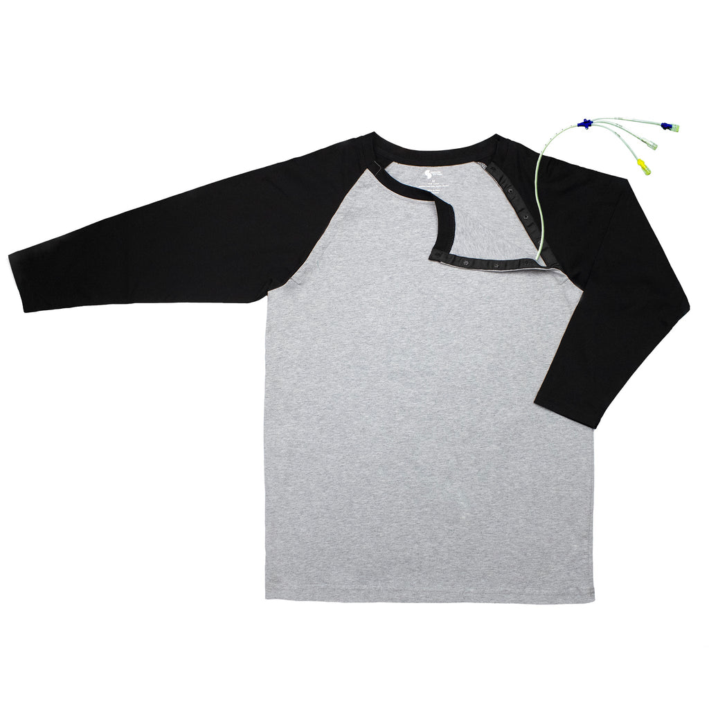 Discover the Spoonie Threads adaptive baseball tee, perfect for cancer treatments and post-surgery recovery. Designed for medical access without sacrificing style, this unisex raglan chemo shirt is crafted from soft jersey fabric and features discreet snaps on both shoulders, providing easy access to broviacs, central lines, and port access without the need to undress. The longer sleeves offer added warmth and comfort during infusion treatments, and the fully open snaps make dressing easier for those with limited mobility or recovering from surgery. Nurses love the convenience of the access ports, and our low-profile snaps with soft fabric backing are MRI-friendly and perfect for securing loose lines during treatment. Say goodbye to medical-looking attire and hello to effortless dignity at appointments!