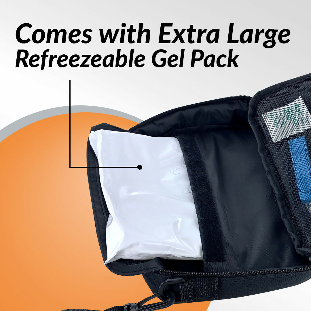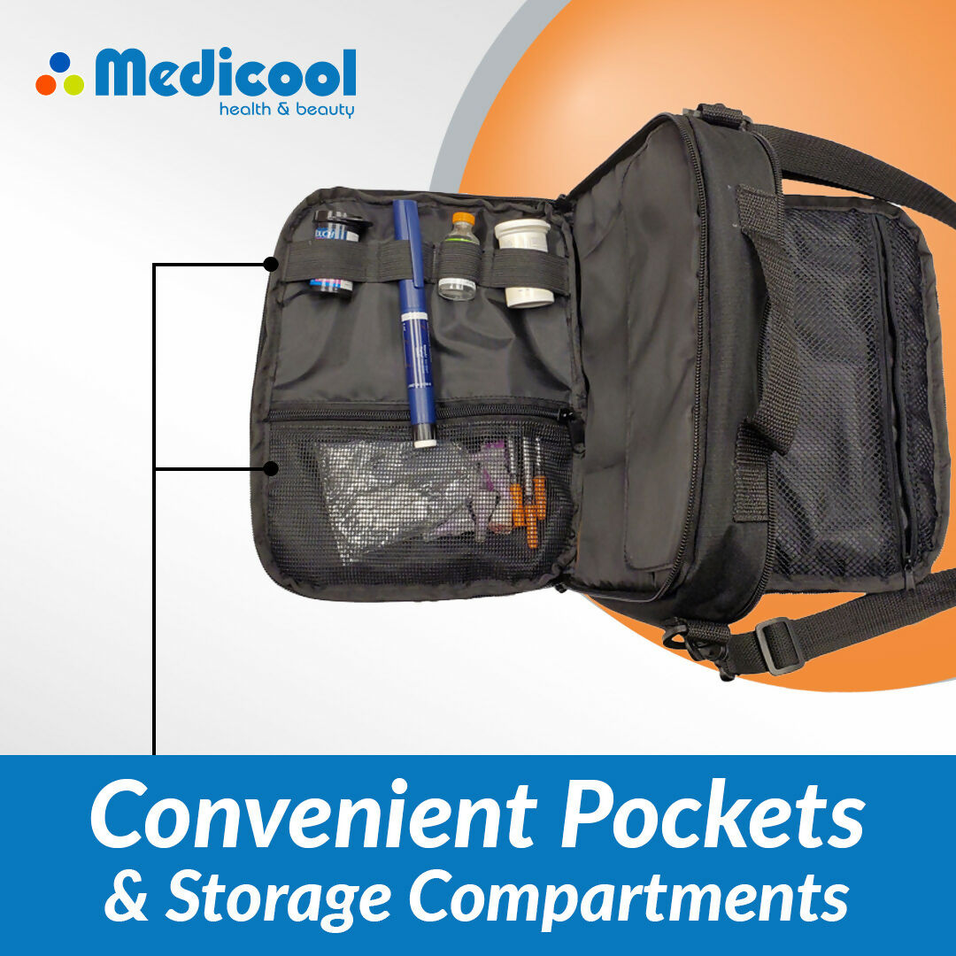 - 2 Large and 1 small pocket hold syringes, needles, pre-filled pen systems, and all other required supplies. Also features shoulder strap & carrying handle.