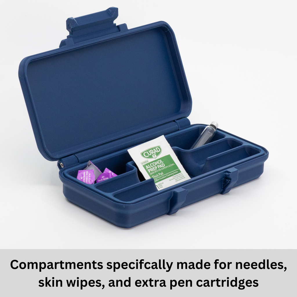 Stay organized and ready for every injection with this compact insulin pen case. Designed to fit two pens. compatible with both long-acting and short-acting insulin as well as GLP-1 medications. Holds up to 10 new pen needles and several alcohol wipes. Perfect for keeping all your essentials in one secure, travel-friendly place.