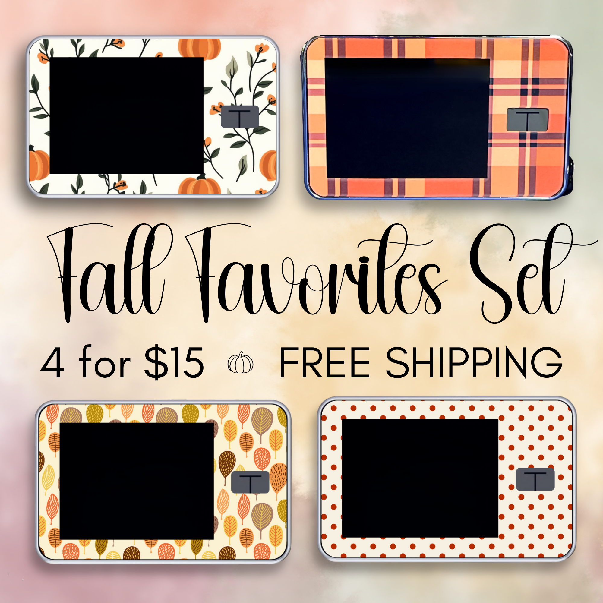 Celebrate the cozy charm of autumn with our Fall Favorites Set for Tandem T:slim insulin pumps! This vibrant Fall Favorites Set of vinyl skins is perfect for customizing your Tandem T:slim with seasonal flair. Featuring four beautifully designed, autumn-themed decals—Pumpkins & Flowers, Fall Plaid, Charming Fall Leaves, and Autumn Polka Dots—this set adds a touch of fall magic to your daily routine.