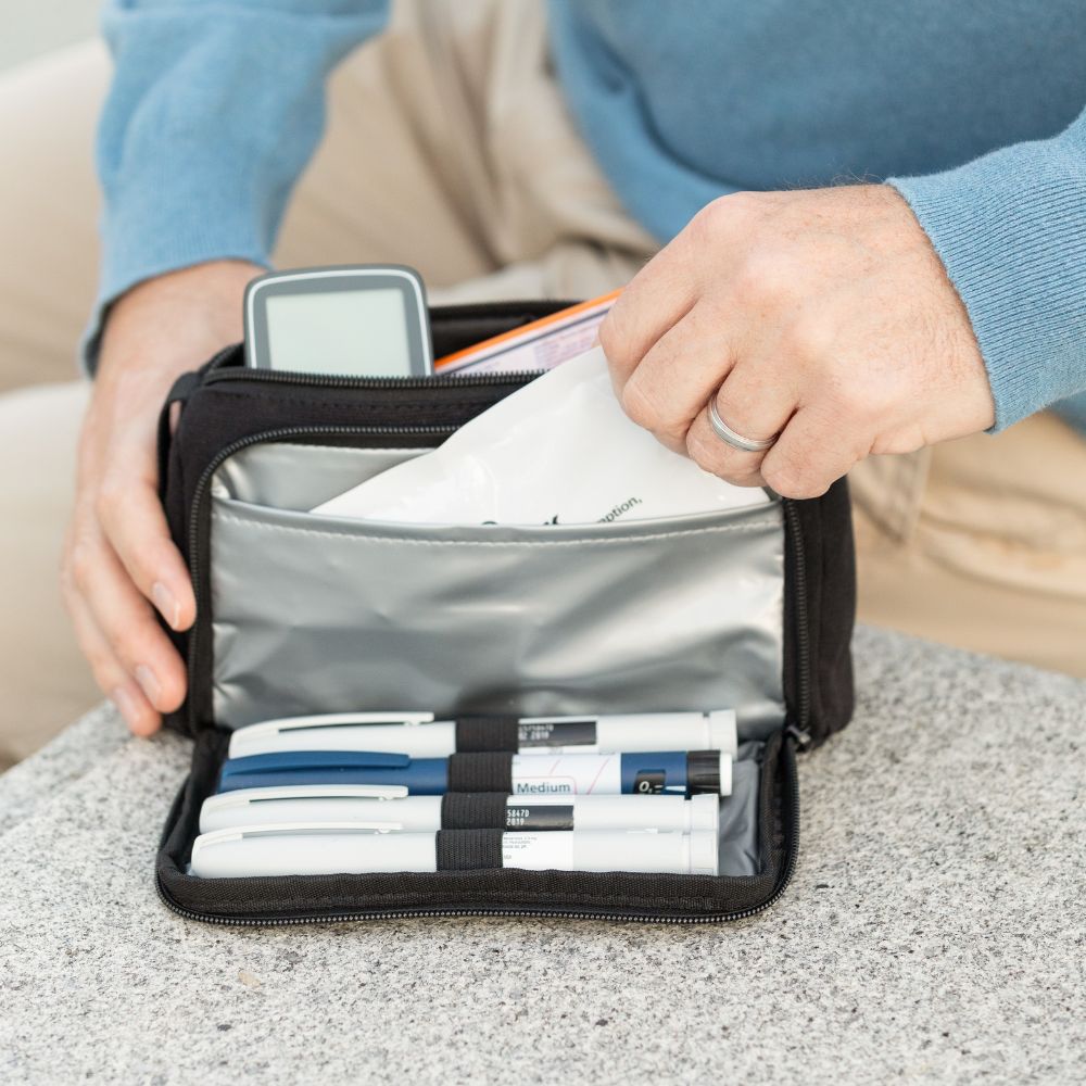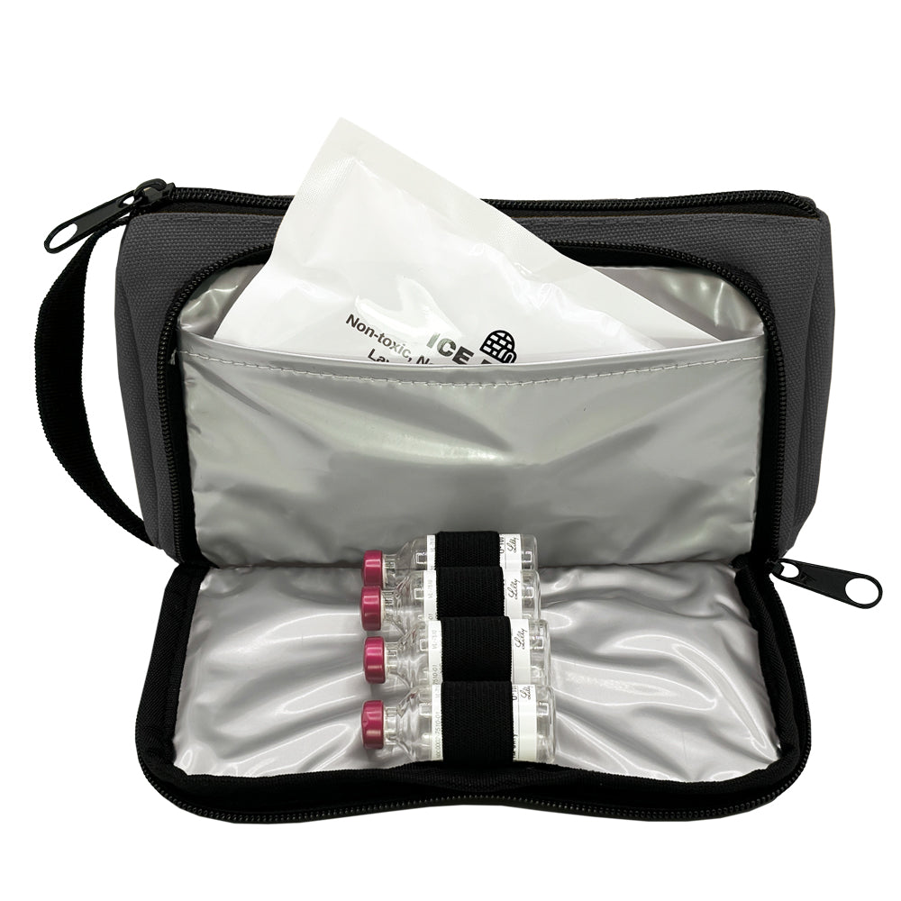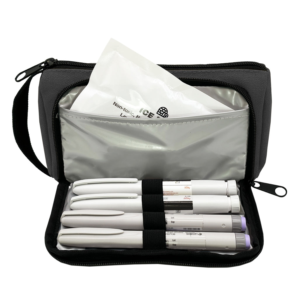 - Insulated front pocket holds 4 medication pens or 4 vials