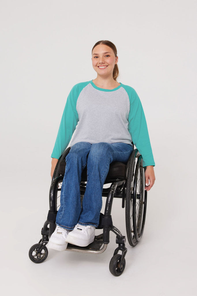 Discover the Spoonie Threads adaptive baseball tee, perfect for cancer treatments and post-surgery recovery. Designed for medical access without sacrificing style, this unisex raglan chemo shirt is crafted from soft jersey fabric and features discreet snaps on both shoulders, providing easy access to broviacs, central lines, and port access without the need to undress. The longer sleeves offer added warmth and comfort during infusion treatments, and the fully open snaps make dressing easier for those with limited mobility or recovering from surgery. Nurses love the convenience of the access ports, and our low-profile snaps with soft fabric backing are MRI-friendly and perfect for securing loose lines during treatment. Say goodbye to medical-looking attire and hello to effortless dignity at appointments!