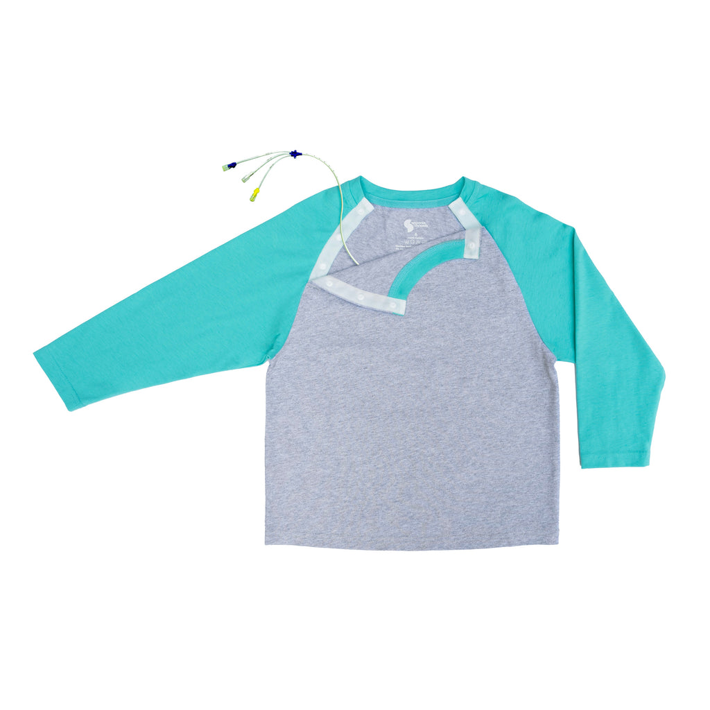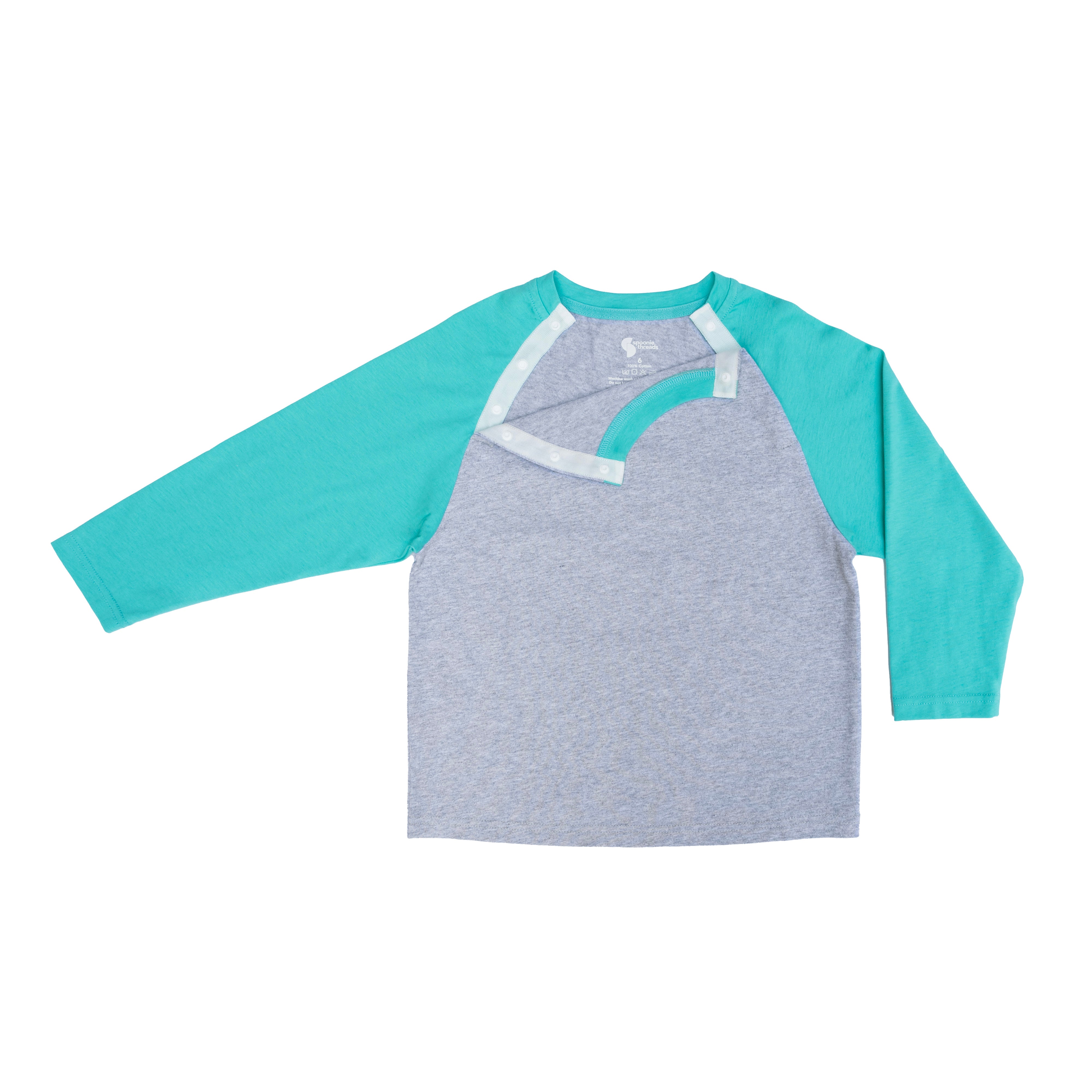 Designed with kids in mind, our Spoonie Threads baseball tee now comes in fresh, new shades and a super-soft 100% cotton jersey. Perfect for post-surgery recovery or hospital visits, it offers hidden access to the chest area-- without looking medical! No need to undress for treatments, the raglan tee features snaps on BOTH shoulders to access central lines and ports including those used for chemotherapy, broviacs, IV fluids/antibiotics, or frequent blood draws.